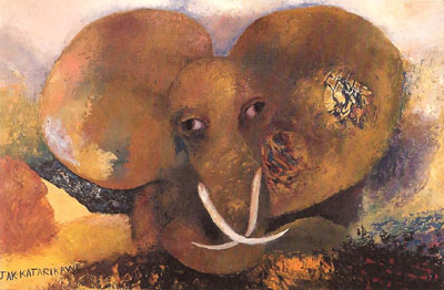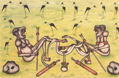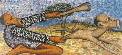 Zachariah Mbutha, "Hunting a strange Animal", huile sur toile,