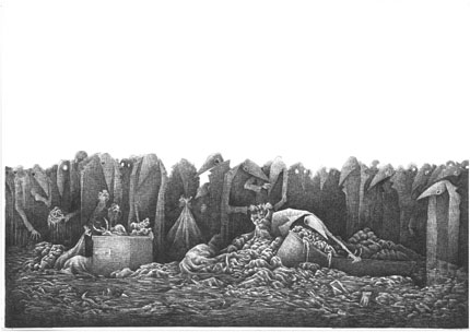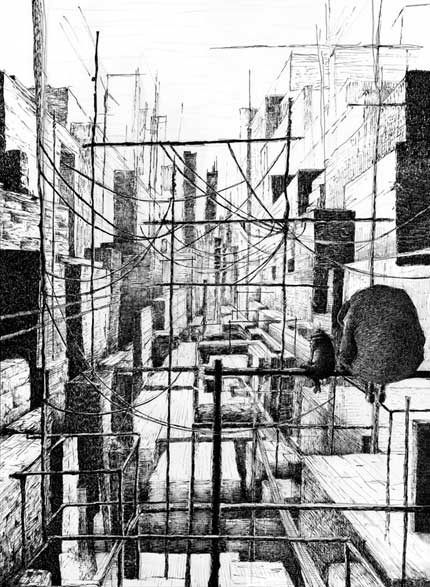 "Puzzled View", Zeichnung für Plattencover, Tinte/ Papier,