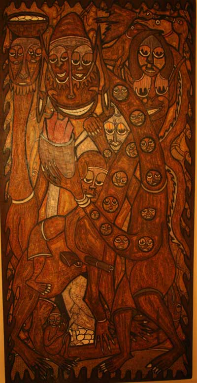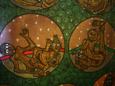 "Twins Seven Seven's Secret Sex House", Detail Mischtechnik auf Holz | Seitenanfang
